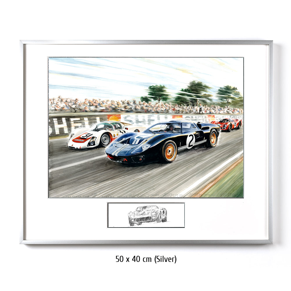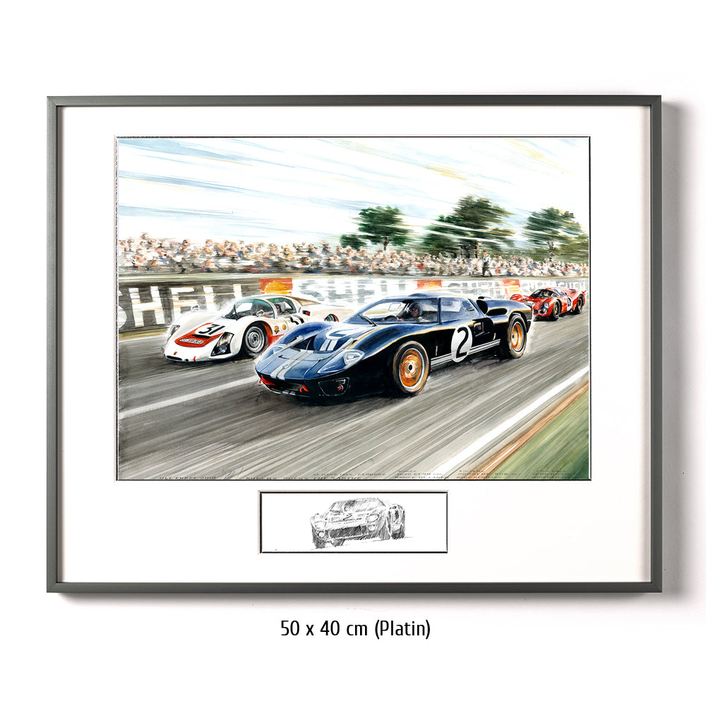 The first of four consecutive Le Mans victories by Ford came in 1966, when the GT 40 took the podium. Following the success of the Cobra coupes, Carroll Shelby was entrusted with the Ford factory program – and the result was outstanding: both Shelby-Am"&"erican race cars finished first and second. However, there is still controversy over the closest finish to date. With the intention of creating a carefully arranged photo of the finish, Ford had instructed both cars to cross the line together, albeit sepa"&"rated by a few meters. The leading Ken Miles and Bruce McLaren in second place obediently did as they were instructed. However, neither the two drivers nor the team management had taken the starting grid into account, and in the end the race control decid"&"ed that McLaren and Chris Amon had covered the greater race distance. This meant that Miles and team partner Dennis Hulme had lost the race by approximately eight meters. Also depicted in the Painting are the Porsche 906 of Herrmann/Linge and the Ferrari "&"330 P3 of Bandini/Guichet. Both Ferrari and Porsche had sent an armada of cars and first-class drivers to Le Mans. But Ford secured the double victory in a memorable race.