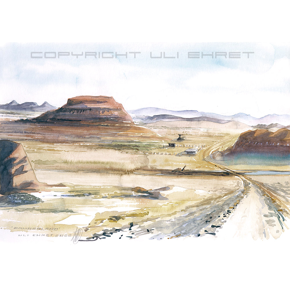 This watercolor depicts our journey between Twyffelfontein and the entrance to the Skeleton Coast National Park. This journey crosses Damaraland, where Twyffelfontei"&"n is located. The view shows the Category C road, a well-maintained gravel track that was well-graded in many places. Originally, cattle ranching was possible in Damaraland. However, the persistent drought of the last two decades has robbed the land of an"&"y predictable fertility. On the approximately 260 km, we passed countless abandoned farms and communities. Lonely people could be seen here and there. Everyone seemed to be starving rather than living.
