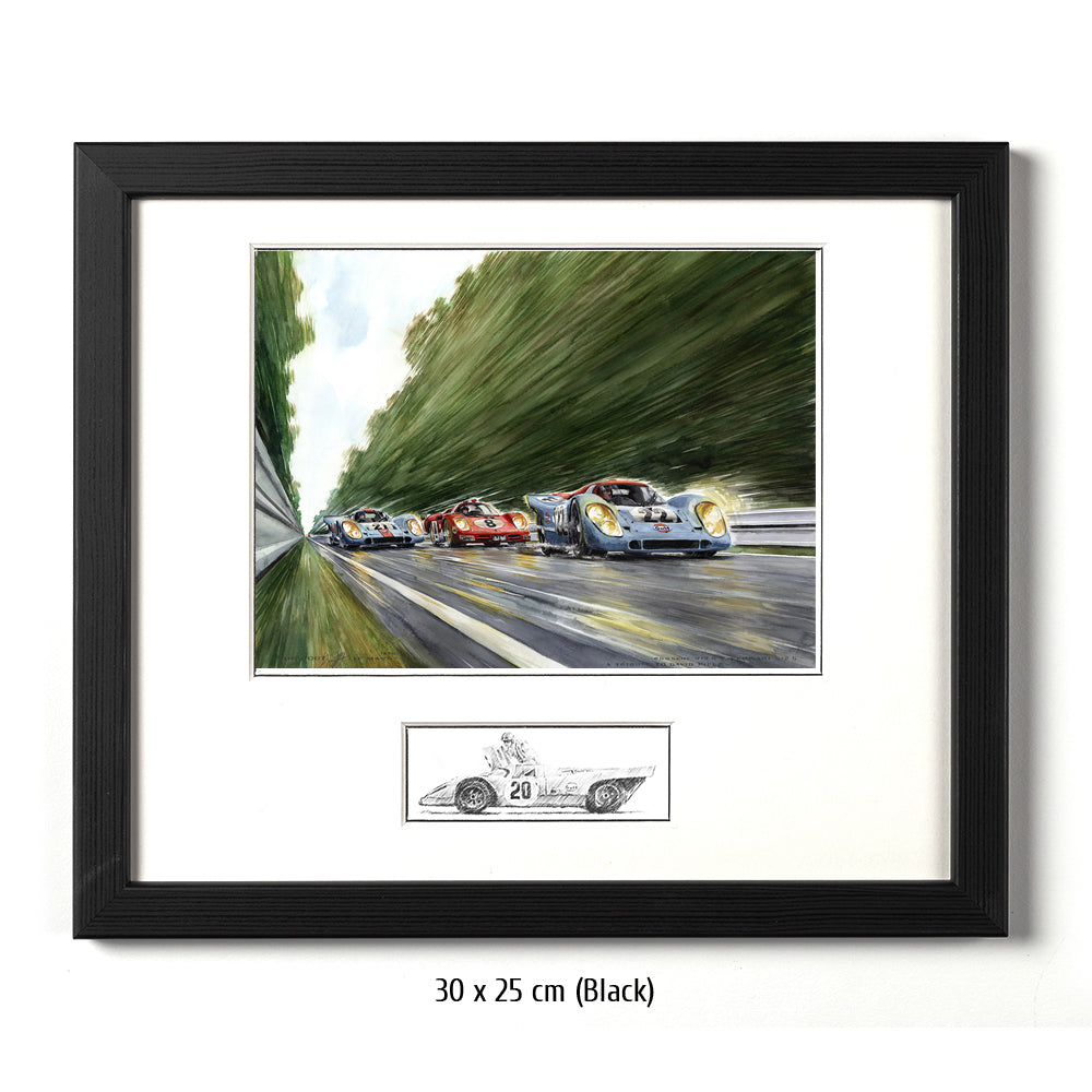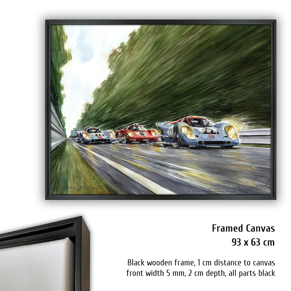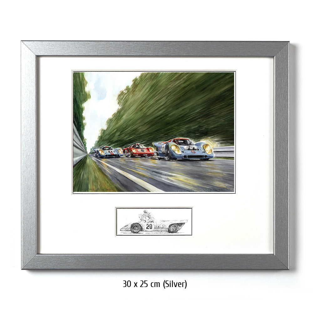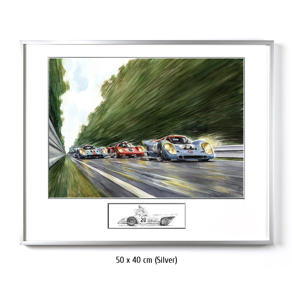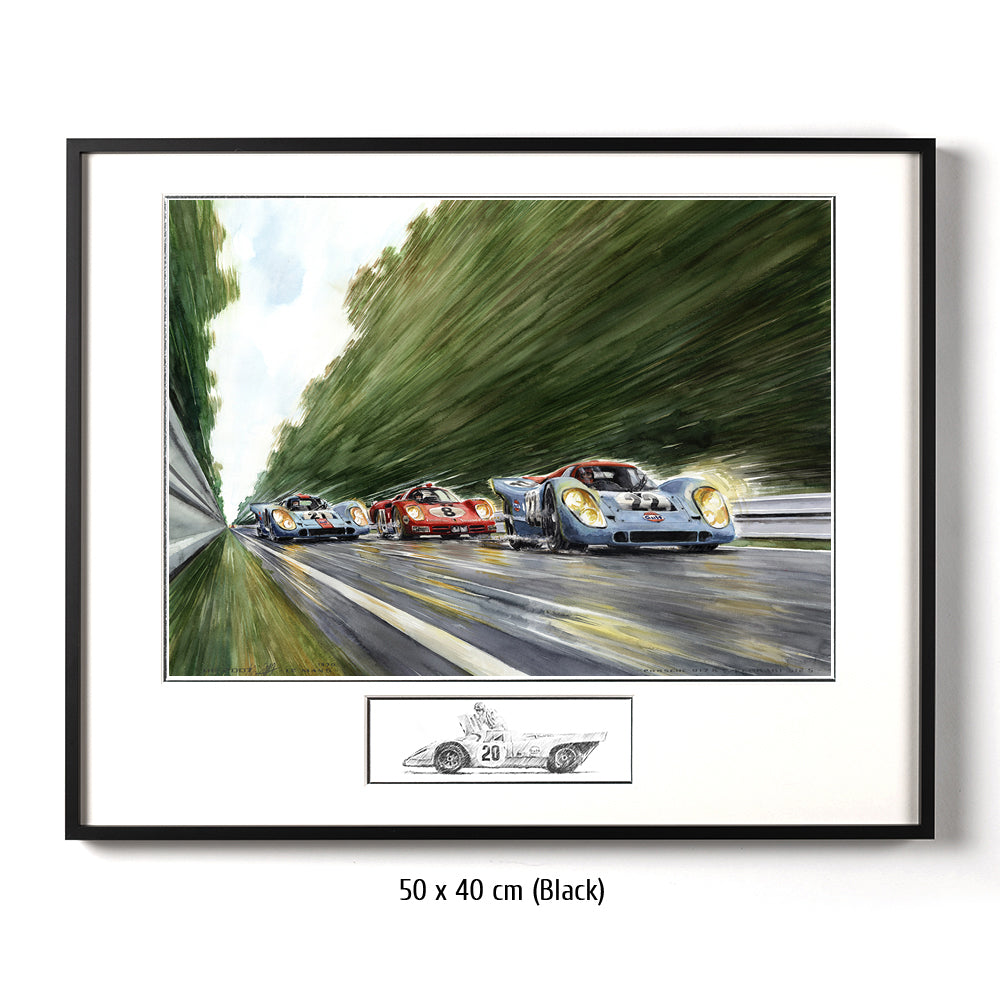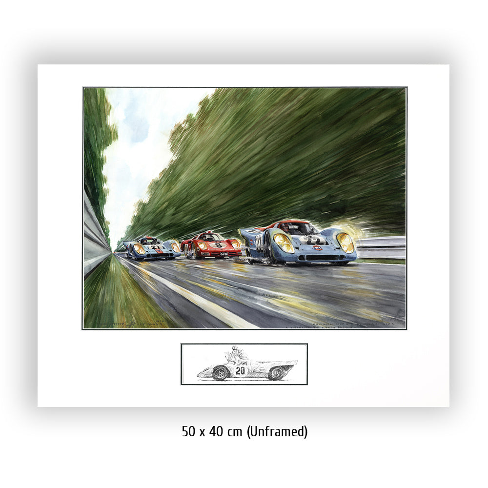 Peut-être la voiture de sport la plus célèbre de tous les temps court vers les courbes Porsche venant de la courbe d'Arnage. Pas une seule Porsche 917 aux couleurs Gulf conduite par John Wyer ne parcourra toute la distance en 1970, mais grâce à Hollywood et Steve McQueen, les 917 aux couleurs Gulf sont créditées d'une légende qui est fausse pour Le Mans 1970. La 917 n°20 a un accident dans le film. David Piper perd une jambe en faisant des cascades pendant le tournage car il exécute violemment la scène de l'accident dans les virages Porsche. Cependant, la scène peinte à l'aquarelle d'Uli Ehrlich montre le dernier tour du film, lorsque McQueen est passé aux blocs 917 n ° 21 et "Erich Stahler" dans la Ferrari 512 afin que la Porsche n ° 22 de tête puisse gagner.