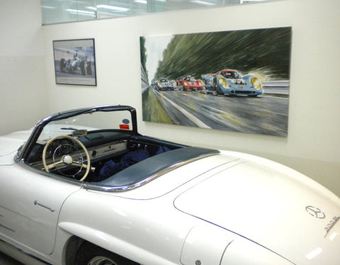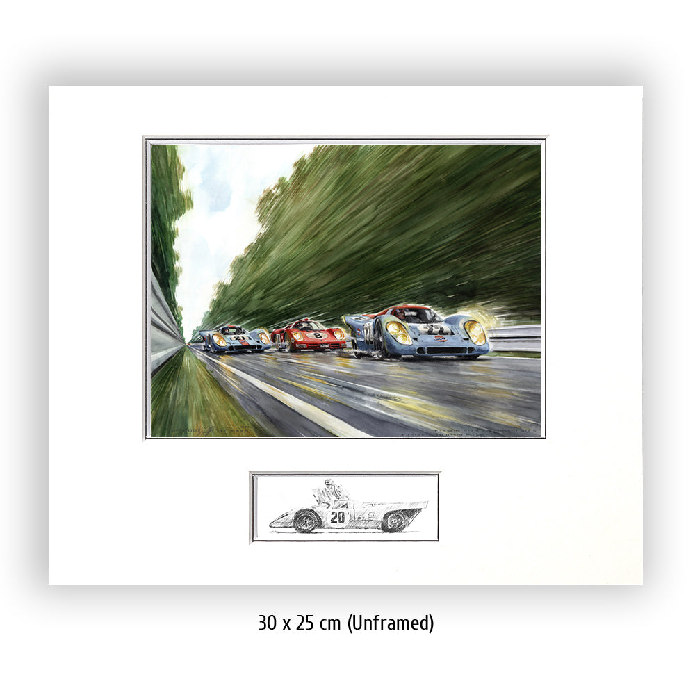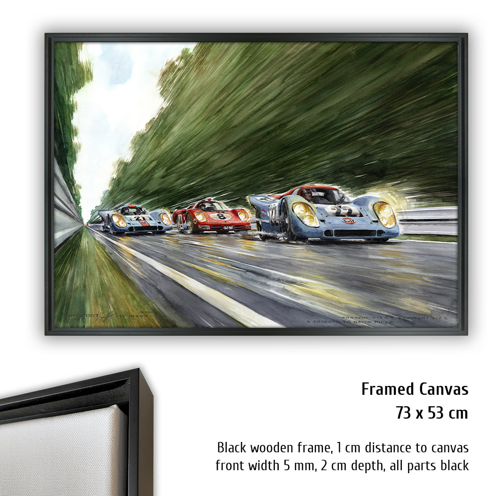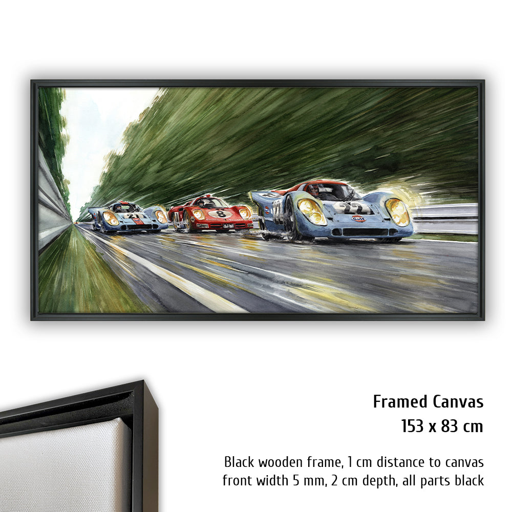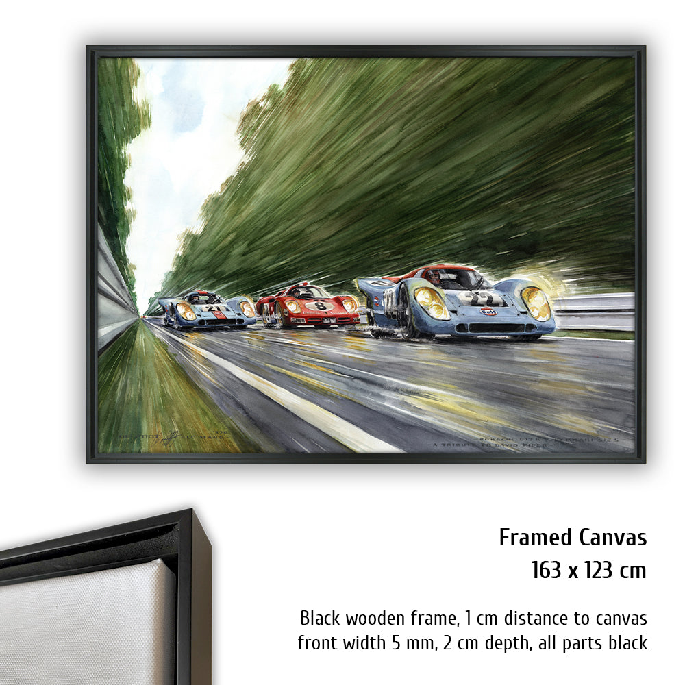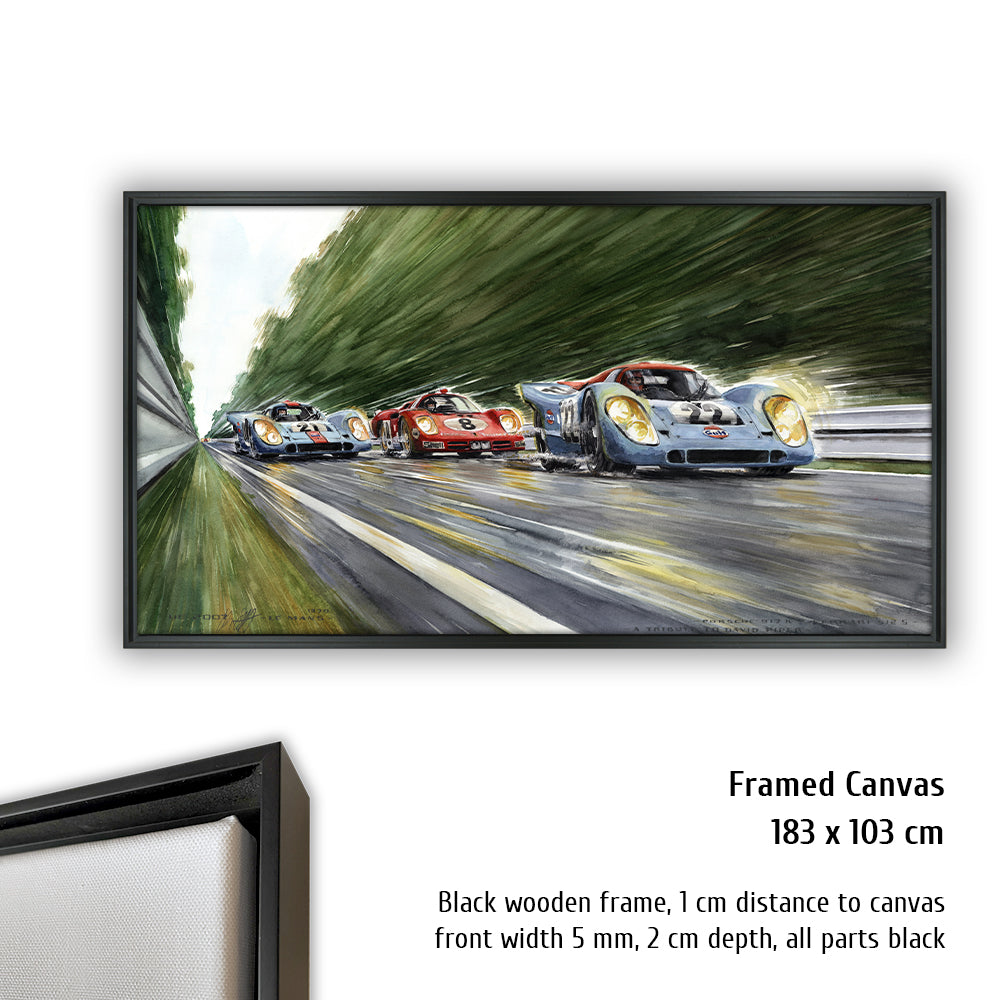 Peut-être la voiture de sport la plus célèbre de tous les temps court vers les courbes Porsche venant de la courbe d'Arnage. Pas une seule Porsche 917 aux couleurs Gulf conduite par John Wyer ne parcourra toute la distance en 1970, mais grâce à Hollywood et Steve McQueen, les 917 aux couleurs Gulf sont créditées d'une légende qui est fausse pour Le Mans 1970. La 917 n°20 a un accident dans le film. David Piper perd une jambe en faisant des cascades pendant le tournage car il exécute violemment la scène de l'accident dans les virages Porsche. Cependant, la scène peinte à l'aquarelle d'Uli Ehrlich montre le dernier tour du film, lorsque McQueen est passé aux blocs 917 n ° 21 et "Erich Stahler" dans la Ferrari 512 afin que la Porsche n ° 22 de tête puisse gagner.