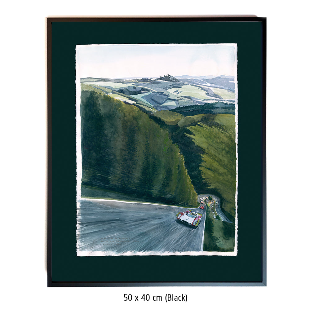 La Porsche 908 Jo Siffert / Brian Redman mène la passionnante bataille à trois devant la Ferrari 312P de Chris Amon et Pedro Rodriguez aux 1000 km 1969 au Nürburgring. Gerhard Mitter et Udo Schütz dans la deuxième Porsche 908 se battent pour la tête au début, mais doivent ensuite abandonner avec des roulements endommagés sur l'essieu avant. Avec la pluie à mi-course, l'enfer vert du Nürburgring se fait à nouveau un nom. Néanmoins, c'était une journée spéciale pour les voitures de course de Zuffenhausen : la première à la cinquième place est revenue à Porsche. Le premier titre de champion du monde de voitures de sport pour l'usine est un fait accompli.