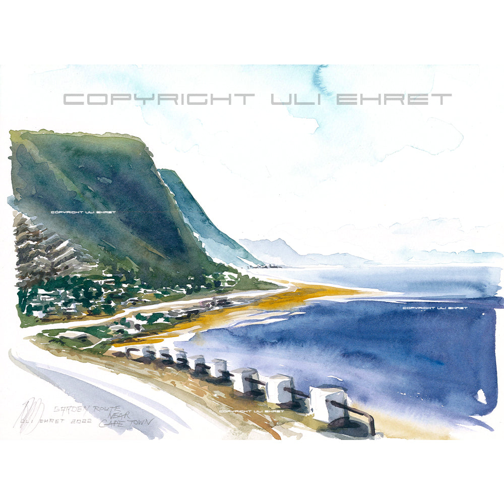 Die Garden Route zieht sich von Kapstadt bis Port Elizabeth an der Pazifikküste Südafrikas entlang. Das Aquarell zeigt einen typischen Blick mit den extrem hohen Bergen, die steil zum Meer hin abfallen.