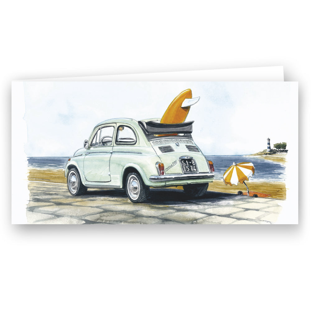 Der Titel bedeutet in Deutscher Sprache "Glücklich ohne Wellen", denn das Pärchen des Fiat 500 weiß einen Tag am Meer auch ohne Surfing zu genießen.